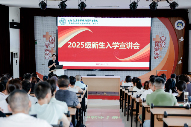 上午9时,2025级新生入学宣讲会在阶梯教室正式召开,新生与家长济济一堂。陈荣凤校长首先代表学校致欢迎辞,回顾了我校悠久的办学历史,介绍了护理专业的培养特色,并深情寄语新生:“秉承医教协同、人文促进、终身发展的理念,努力成长为医康养护基层一线优秀的生命健康守护人!”随后,上海健康医学院护管学院副院长汪庆玲从学院概况、办学条件及学生培养三个方面,详细解读了我校中本贯通护理专业的培养方案,帮助家长与学校共同规划学生的成长路径。