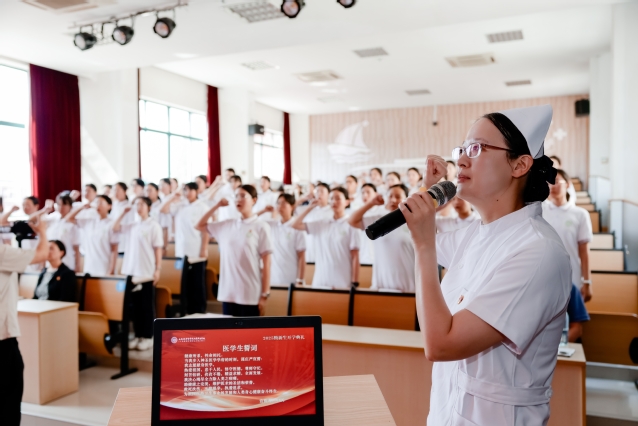 最后,在护理系副主任徐晶心的带领下,全体新生高举右拳,庄严宣读《医学生誓言》——“我志愿献身医学,热爱祖国,忠于人民……”铮铮誓言回荡会场,标志着她们正式踏上医学事业的星辰大海。(学生科)